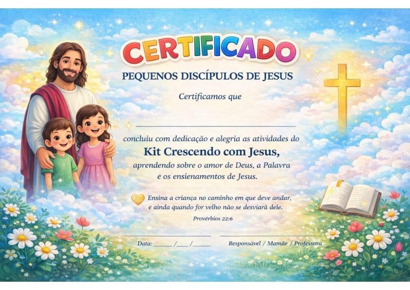 Ao concluir as atividades do kit, a criança recebe um lindo Certificado de Pequenos Discípulos de Jesus, celebrando todo o aprendizado sobre o amor de Deus, a Palavra e os ensinamentos de Cristo.